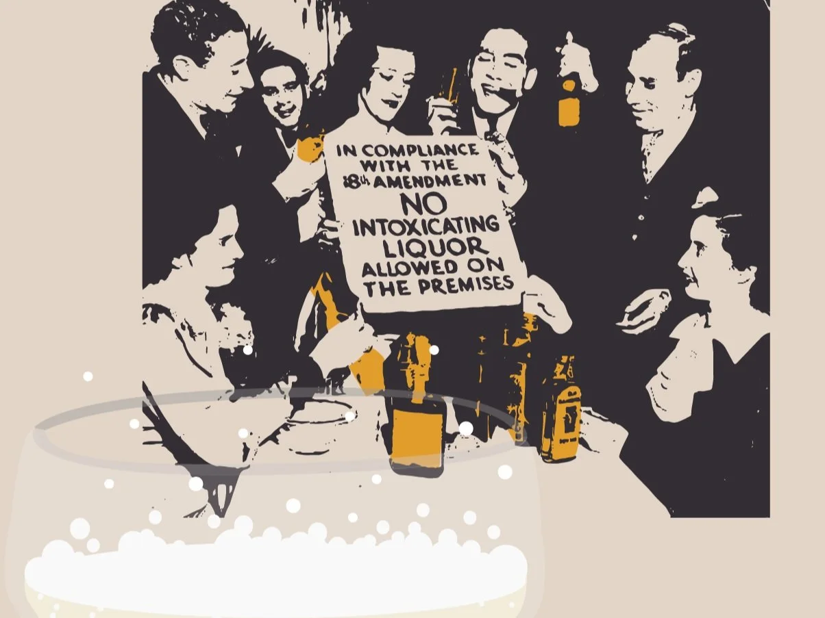 Featuring custom typography, original illustrations, and witty copy, this project summarizes the dry time in American history; Prohibition. These illustrations highlight the events of this time period as a “cocktail of law and disorder.”